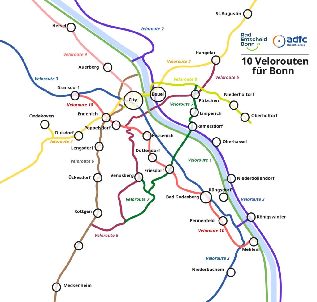 Im April letzten Jahres haben der ADFC Bonn/Rhein-Sieg und wir – der Radentscheid Bonn – unsere Idee der 10 Velorouten für Bonn vorgestellt. Unser Ziel: Durch eine Priorisierung und Fokussierung auf 10 wichtige Fahrradrouten im Bonner Stadtgebiet Geschwindigkeit in die aktive Planung und Umsetzung durchgängiger und sicherer Radinfrastruktur zu bekommen.